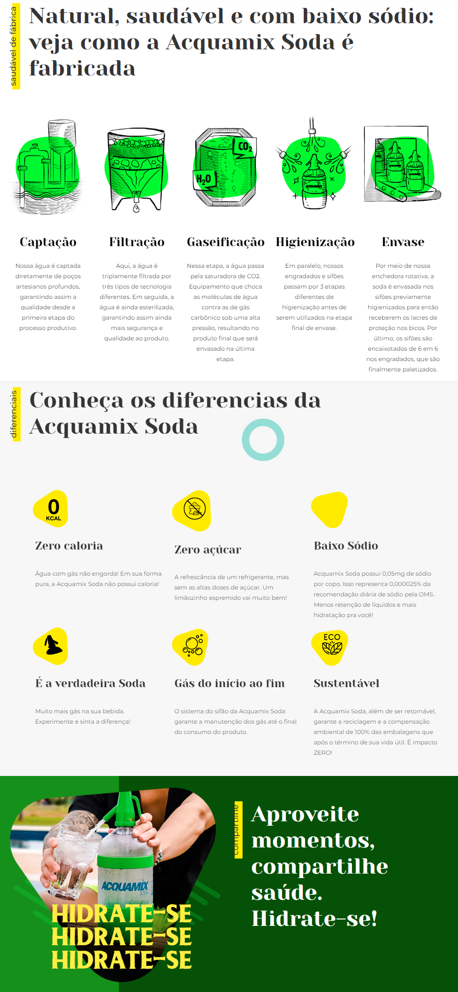 Há mais de vinte anos, a Acquamix é comprometida com a saúde e bem-estar dos seus consumidores. A composição de Acquamix Soda é livre de açúcares, calorias e possui baixíssima quantidade de sódio.